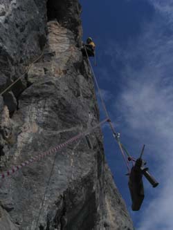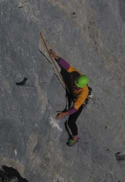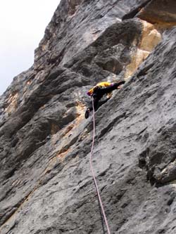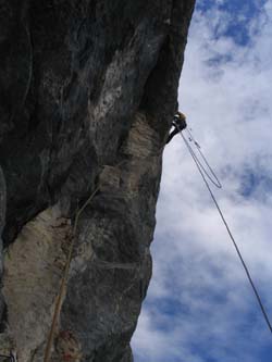 Tag 2: Über die Einstiegsplartte rauf zum 2. Fragezeichen. Die steile Wandpassage der 3.SL erweist sich aber als gut griffig und mit Komfort - Cliffloch, davor wartet jedoch noch eine schwerere Plattenstelle (siehe auch untere Bilder)