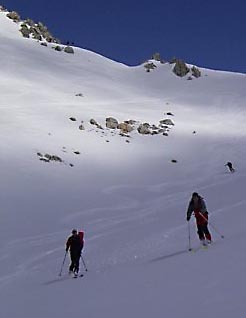 An einer Scharte unterm Gipfelhang des Corn Suvretta ließen wir es dann gut sein, da im steilen Südhang der dünne Deckel teisl schon aufweichte.
