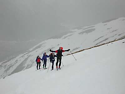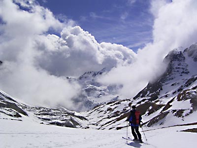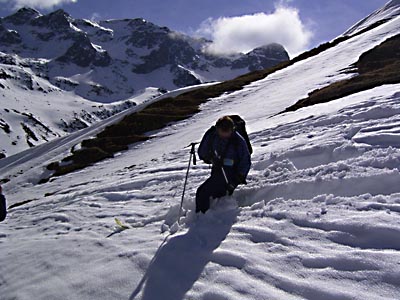 So stoppelsten wir als Großgruppe ins Val Güglia, wo es zumindest anfangs noch nach geschlossener Schneedecke herschaute. Erst nach einer 3/4 Stunde und nach der Überwindung eines nur knapp bedeckten Blockhanges fing dann die Schneedecke teiweise zu tragen an. Gleichzeitig kam allmählich die Sonne heraus und es bildeten sich einige schöne Wolkenstimmungen.